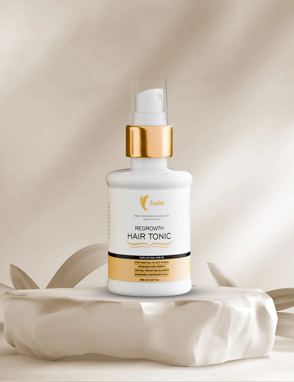 Revive your hair naturally with Zeshh Regrowth Hair Tonic, a plant-powered formula crafted to stimulate hair growth, reduce hair fall, and rejuvenate the scalp. Enriched with potent natural extracts, essential oils, and vital nutrients, this tonic penetrates deep to activate dormant hair follicles, strengthen roots, and restore thickness—without harsh chemicals.