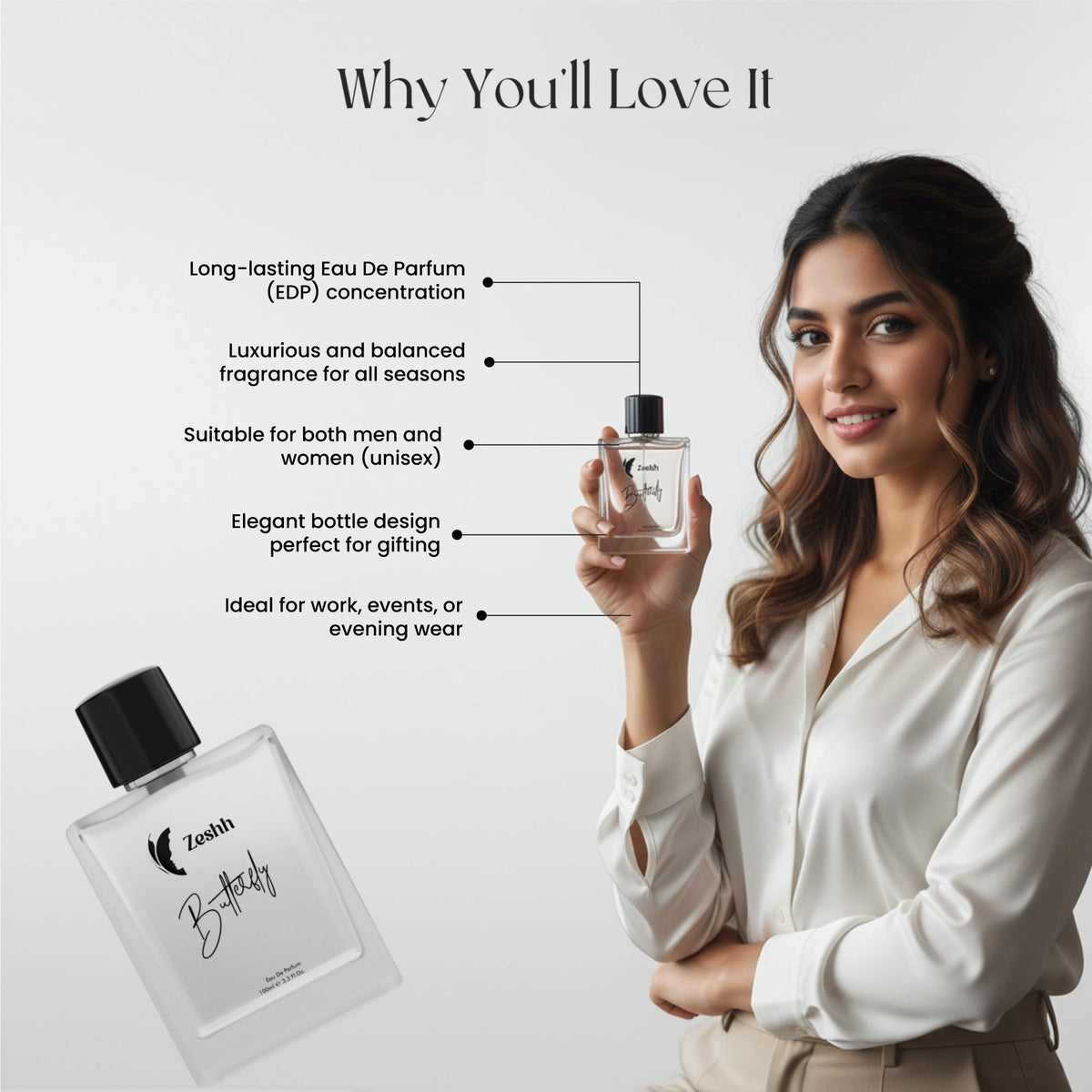 Unfold your charm with Zeshh Butterfly Eau De Parfum — a captivating floral fragrance that blends freshness, femininity, and elegance in every spray. This beautiful scent opens with crisp bergamot, juicy pear, and sweet orange blossom, leading into a soft bouquet of jasmine, rose, and peony, and finally settles into warm, comforting musky, woody, and vanilla base notes.